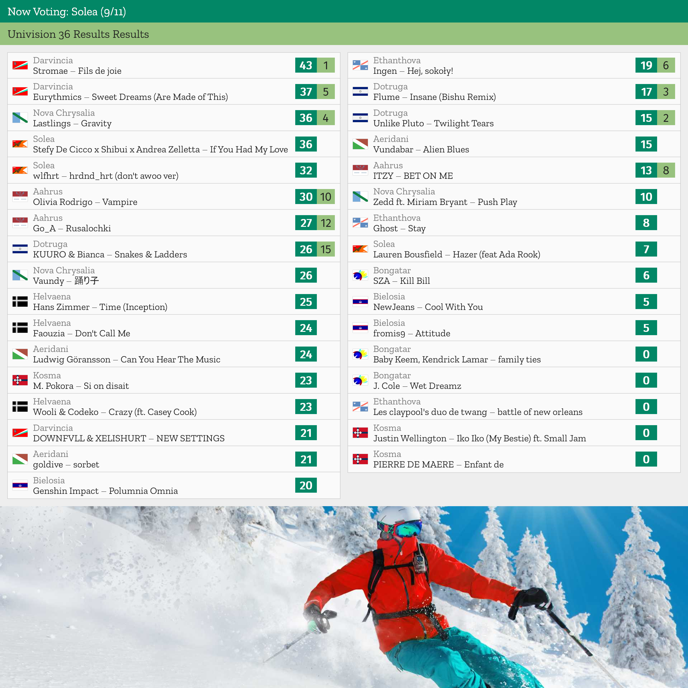 this is the song list 👇👇🏻👇 and the playlist 1. Kosma http://paladinofstorms.net/univision/flags/small/sm_kosma.png Erika Vikman - Elizabeth Taylor 2. Aahrus http://paladinofstorms.net/univision/flags/small/sm_aahrus.png ITZY - RINGO 3. Ethanthova http://paladinofstorms.net/univision/flags/small/sm_e...